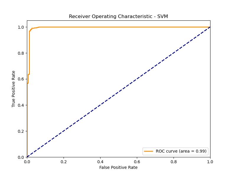 - Evaluation and Visualization: Displaying performance using ROC curves and metrics such as accuracy, precision, recall, and F1 score.