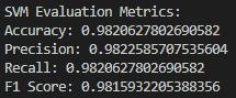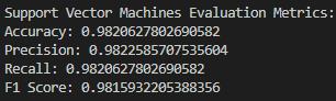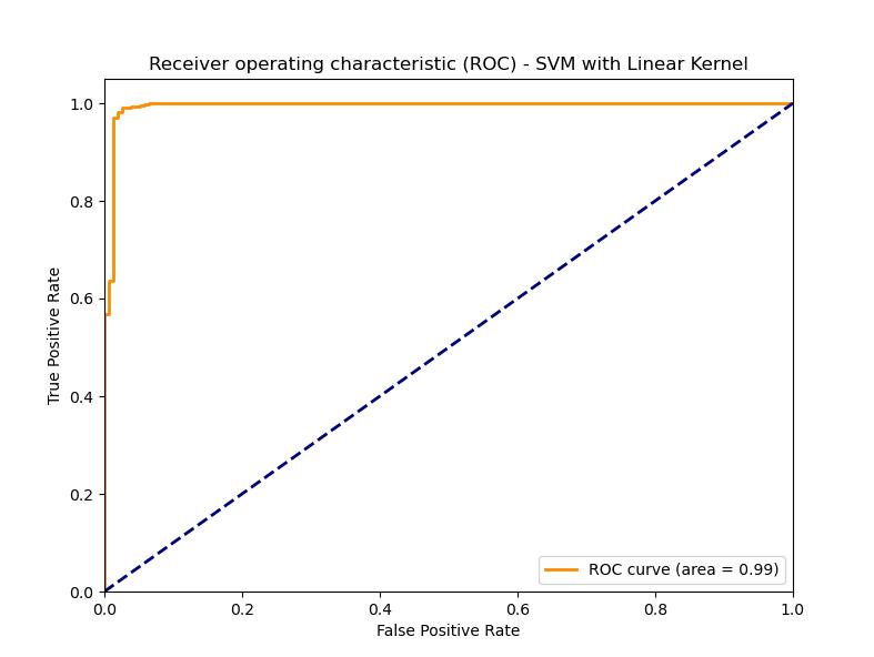 - Model Training: Utilizing the “sklearn” library's SVC class with a linear kernel to train the SVM model on the pre-processed training data. Training involves adjusting the model parameters to minimize prediction errors.