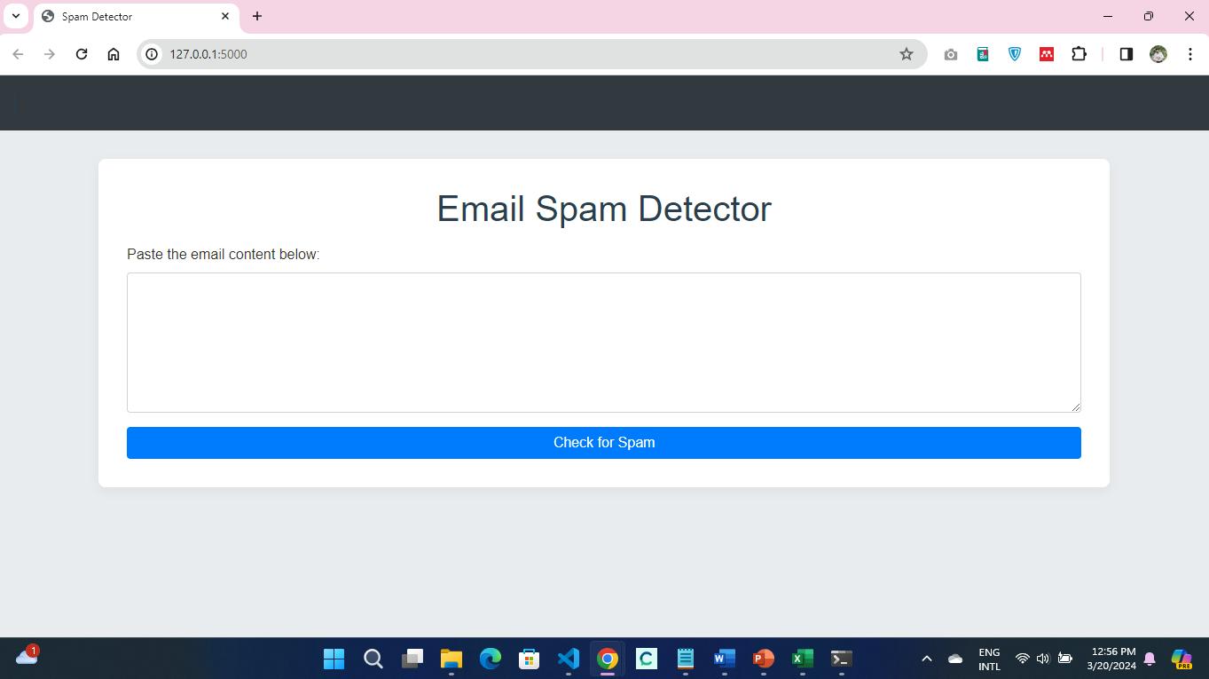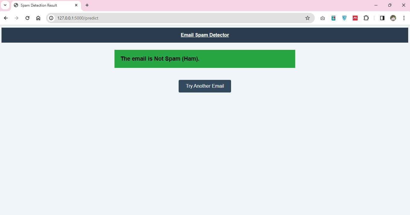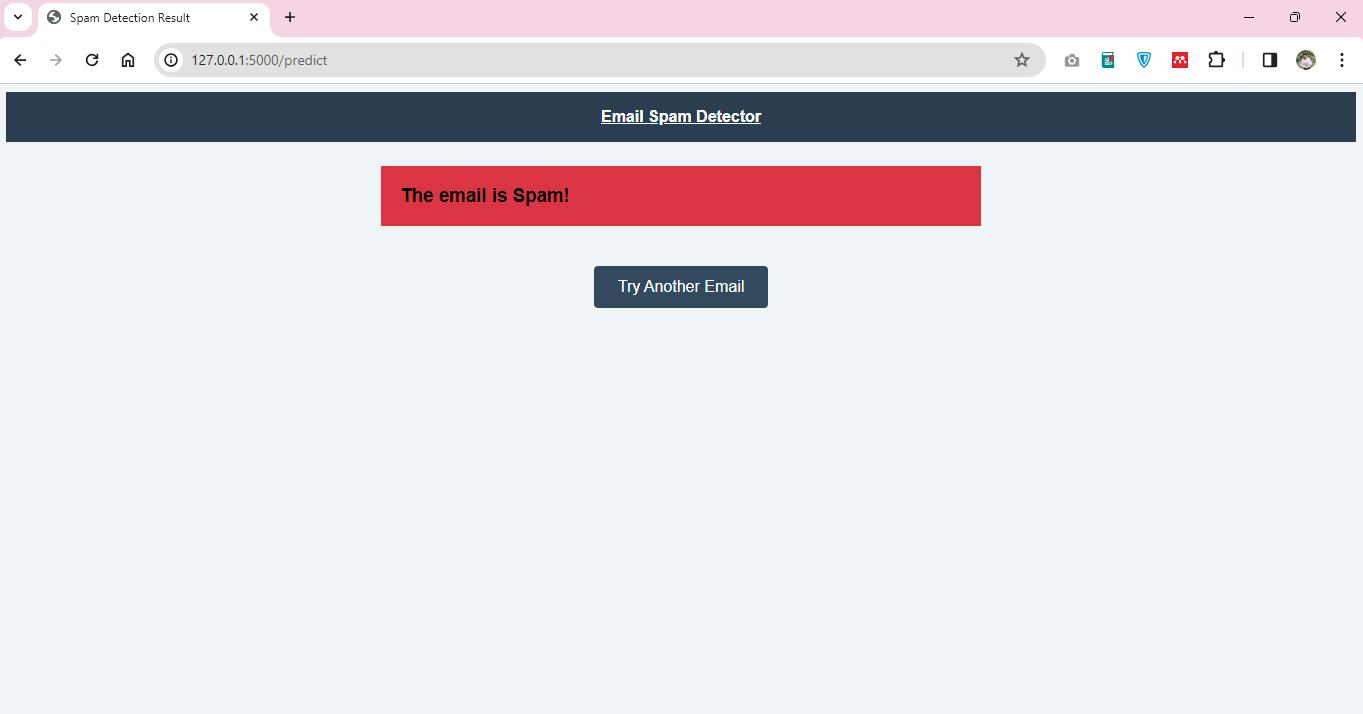 The spam detection application will provide users with a box where they will be required to enter the contents of an email, which will then be processed through an SVM classification model. The web application is the interface used to display the classification results, which are either classified as spam or legitimate. The application operates on a local server, as denoted by the IP address 127.0.0.1:5000, which indicates that the application was developed on the local server for development purposes. In this regard, it uses a web framework, presumably Flask, for its backend operations, which is the popular option for such tasks because of its lightweight and flexible nature.