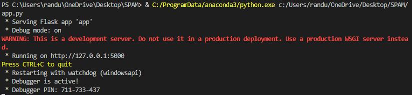 When executing the spam detection application, the following output is generated in the console, indicating that the Flask app named 'app' is in active development mode and running on the local server. Debug mode in Flask enables the coders to see the changes to the code in real-time while the server is running and offers an in-browser debugger for problem-solving.