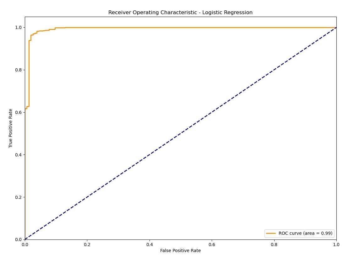 The ROC curve shows Logistic Regression a high area under the curve (AUC), revealing a good performance in terms of distinguishing spam from ham emails. The curve follows the upper left corner quite well, which means the true positive rate and false positive rate are in a balance. Logistic Regression is an excellent method, providing a high accuracy along with balanced metrics, and therefore, it can be safely used for binary classification tasks.